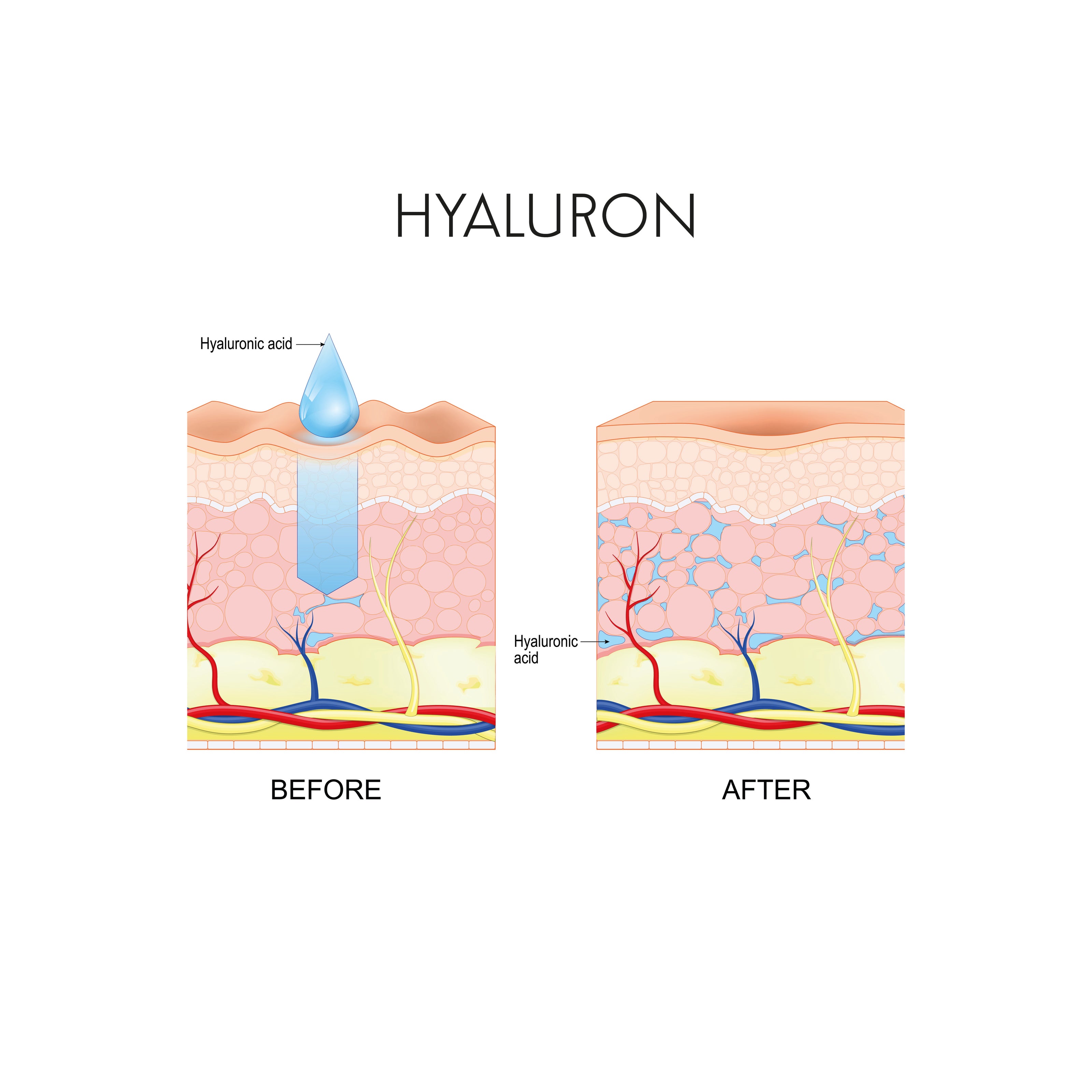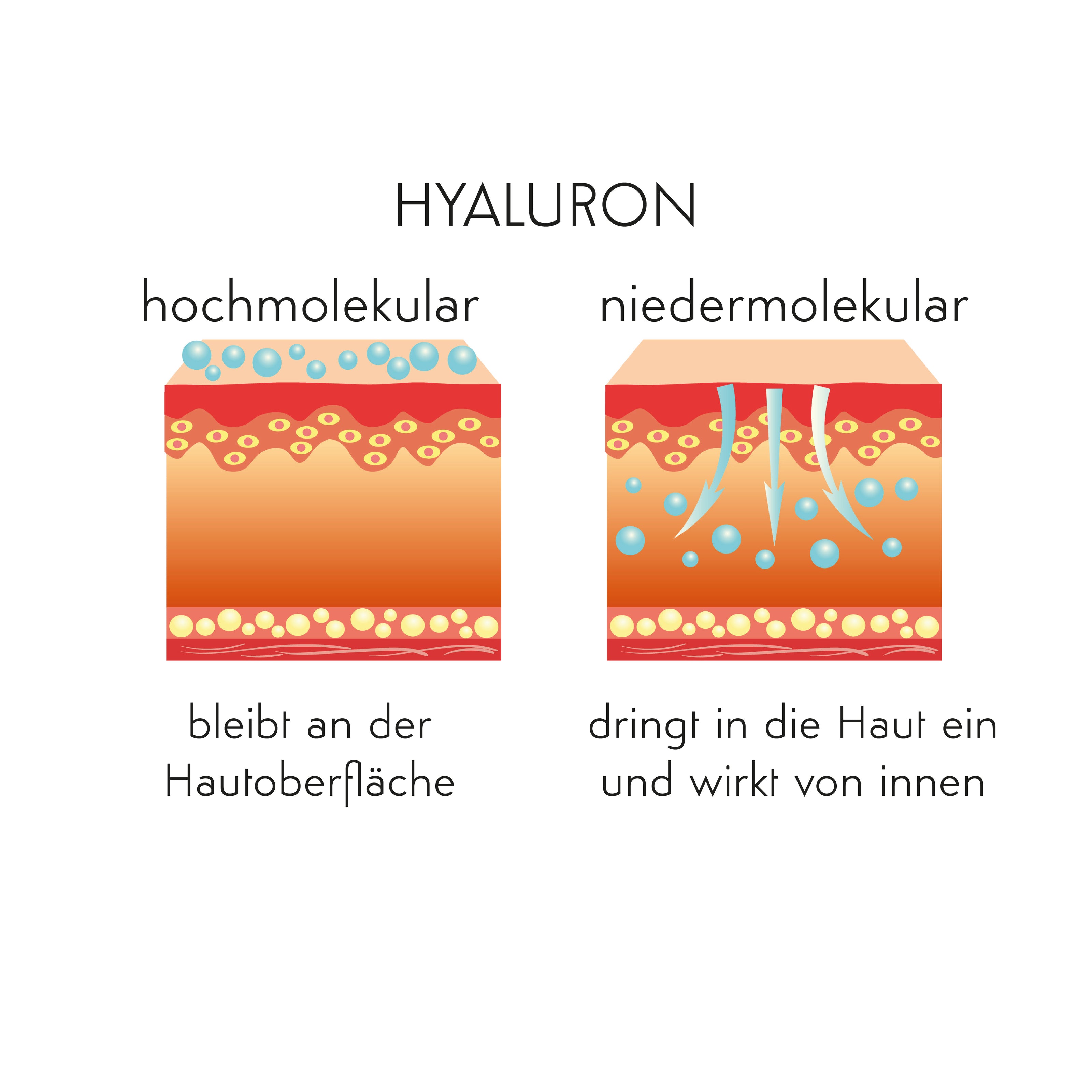 Je kleiner das Molekulargewicht ist, desto tiefer dringt die Hyaluronsäure in die Haut ein, speichert dort Wasser, polstert das Gewebe so auf und minimiert im Endeffekt Falten.